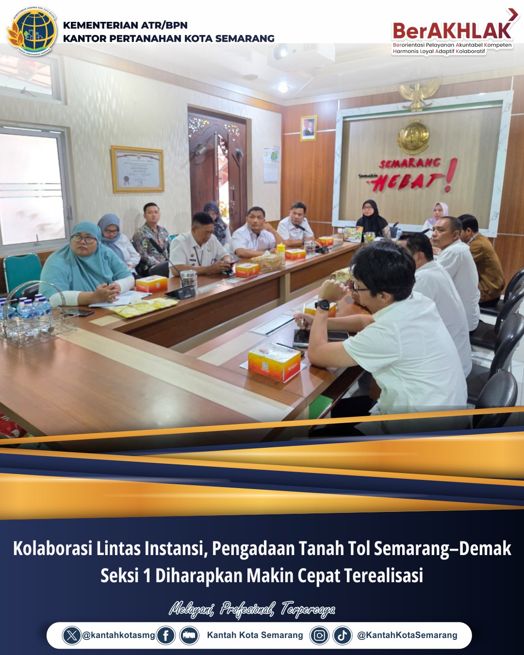 Kantor Pertanahan Kota Semarang menegaskan komitmennya untuk terus bersinergi dengan pemerintah daerah, instansi teknis, dan seluruh pemangku kepentingan demi kelancaran proses pengadaan tanah yang profesional, transparan, dan berkeadilan.