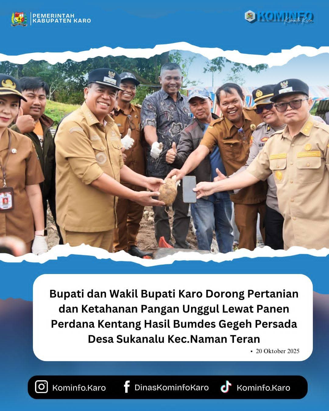 KARO, TEMPO86.com__, Dalam upaya mendukung ketahanan pangan daerah, Bupati Karo, Brigjen Pol (Purn) Dr. dr. Antonius Ginting, Sp.OG., M.Kes., bersama Wakil Bupati Karo, Komando Tarigan, SP., melaksanakan panen perdana kentang di Desa Sukanalu, Kecamatan Naman Teran, pada Senin (20/10/2025).