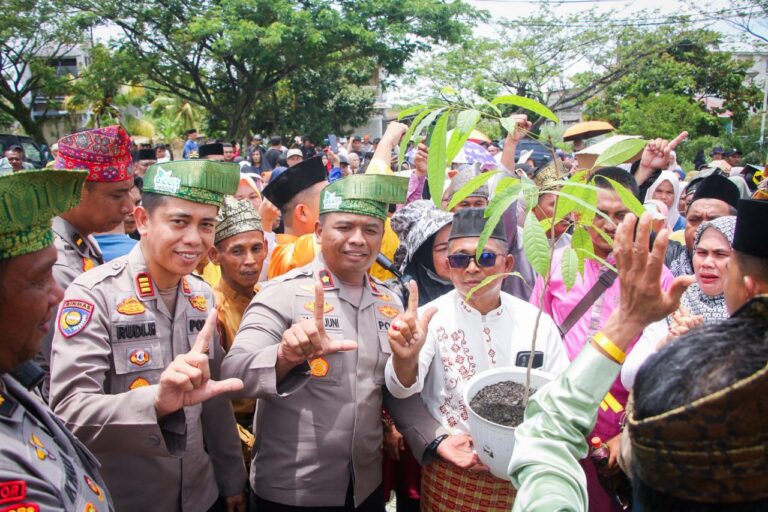 TEMPO86.com_, ROKAN HULU, Polres Rokan Hulu berhasil menjaga keamanan ratusan masyarakat Persukuan Melayu Rantau Kasai (PMRK) yang menggelar aksi unjuk rasa di Mapolres dan Kantor DPRD Kabupaten Rokan Hulu, Selasa (7/4/2026). Dalam pengamanan, aparat tidak hanya menjaga ketertiban, tetapi juga menghadirkan pendekatan humanis dan penuh kearifan lokal, serta penguatan Green Poliching melalui penyerahan bibit pohon.
